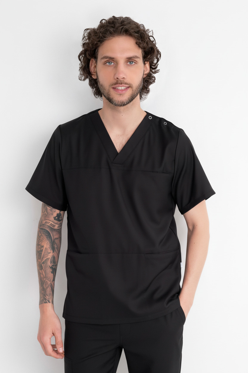 Мужская медицинская туника TZ600 имеет прямой крой, короткий рукав, разрезы по бокам и V-образный вырез. Модель дополнена тремя прорезными карманами: два накладных и один нагрудный. Для удобства на правом плече имеется застежка на металлических кнопках.