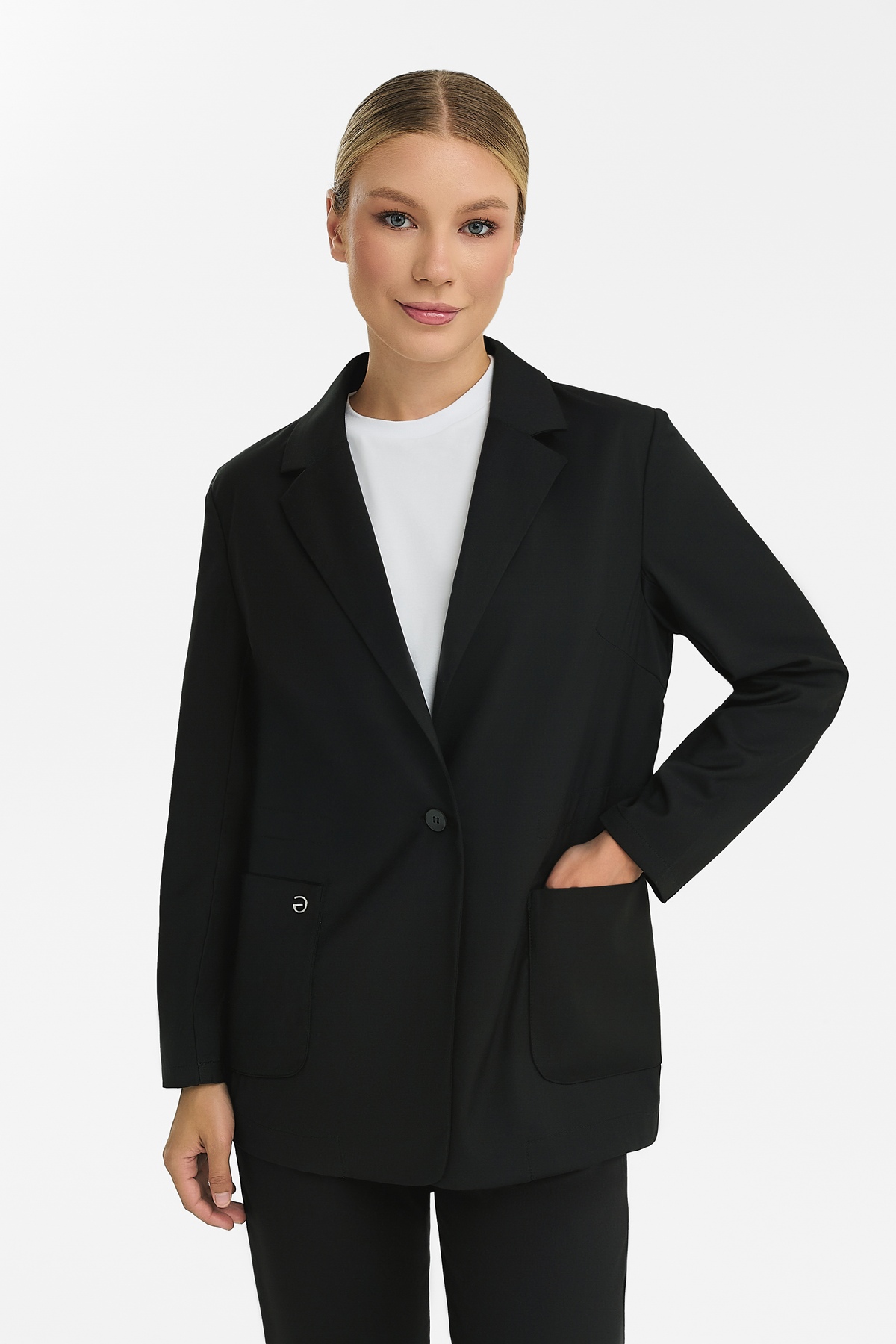 В основе дизайна — классическая архитектура пиджака с отложным воротником и застежкой на одну пуговицу. Ключевой особенностью является внутренняя кулиска на талии, которая позволяет трансформировать силуэт: от прямого и свободного до изящно приталенного, акцентирующего фигуру. Крупные накладные карманы поддерживают современный и менее формальный характер модели.