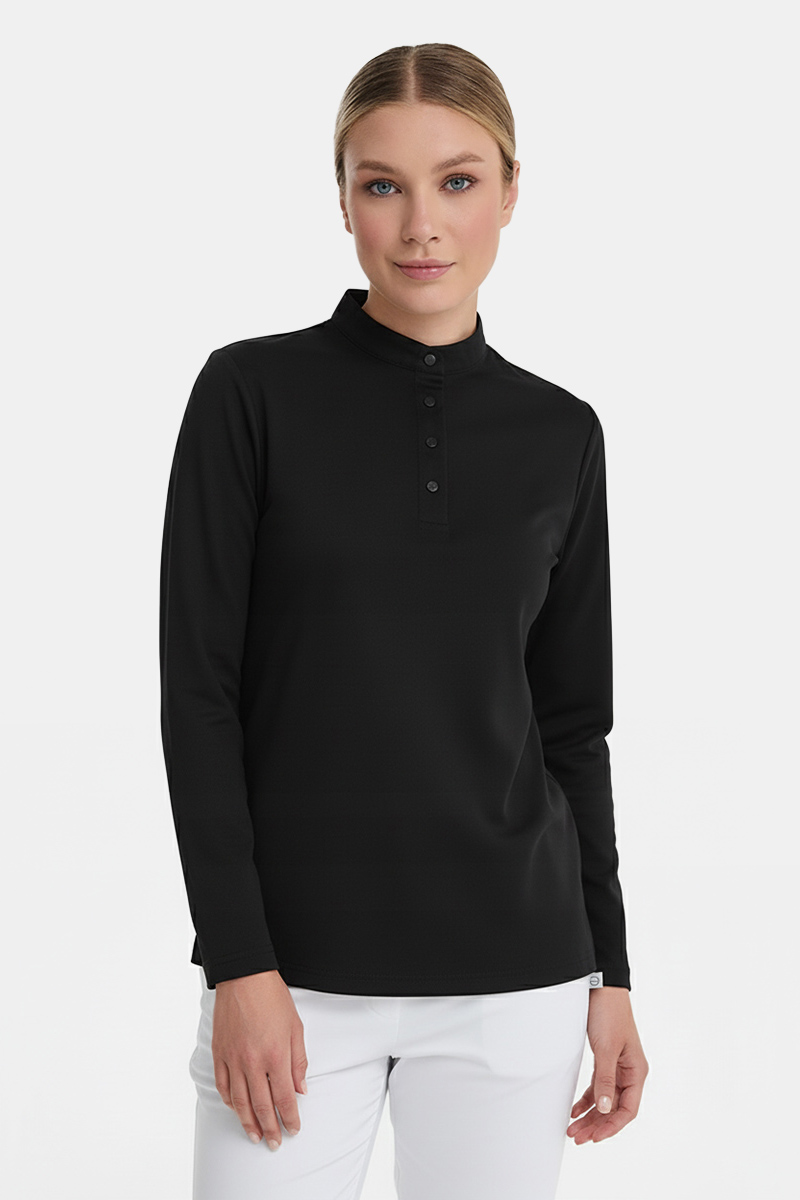 В основе дизайна — контраст фактур: передняя часть поло выполнена из гладкой ткани, а спинка и длинные рукава — из текстурированного материала. Такое решение не только создает современный образ, но и обеспечивает превосходный воздухообмен в зонах повышенной теплоотдачи. Лаконичный воротник-стойка и планка на пуговицах формируют элегантную и строгую линию верха.