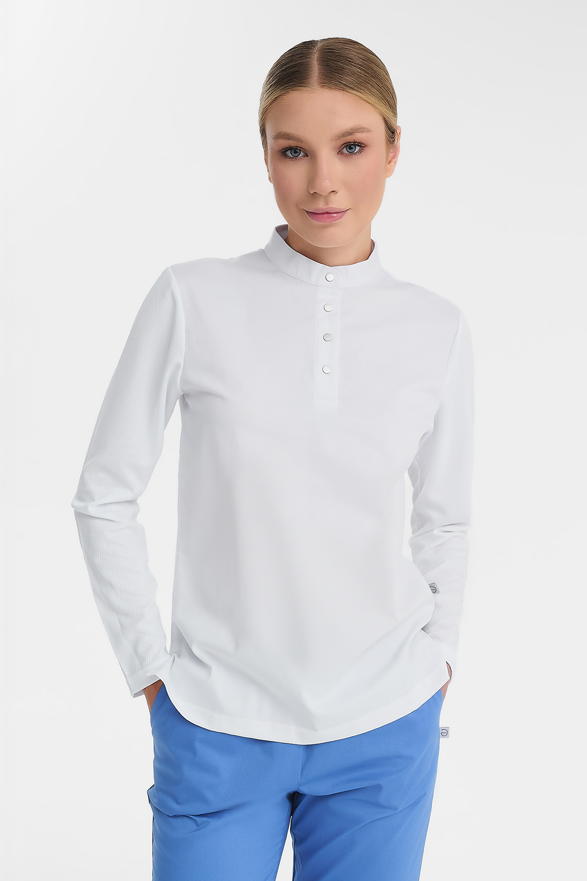 В основе дизайна — контраст фактур: передняя часть поло выполнена из гладкой ткани, а спинка и длинные рукава — из текстурированного материала. Такое решение не только создает современный образ, но и обеспечивает превосходный воздухообмен в зонах повышенной теплоотдачи. Лаконичный воротник-стойка и планка на пуговицах формируют элегантную и строгую линию верха.