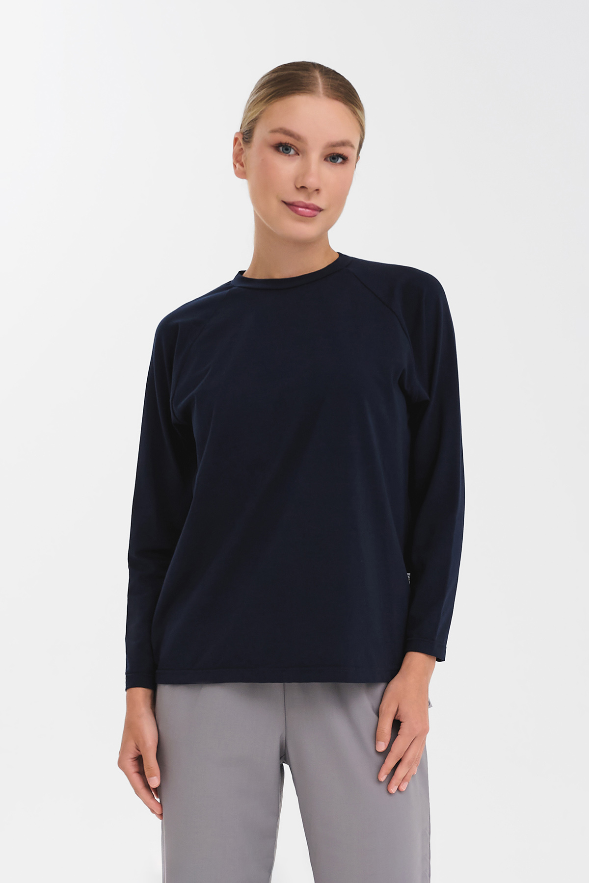 В основе дизайна — расслабленный крой оверсайз с рукавами реглан. Такое конструктивное решение обеспечивает максимальную свободу движений в плечевом поясе и создает мягкую, естественную линию плеча. Лаконичный круглый вырез и отсутствие лишних деталей делают этот лонгслив идеальной базой как для ношения под медицинский халат, так и как самостоятельный элемент гардероба.